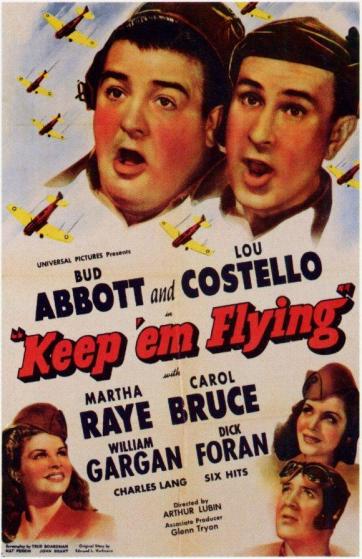 KEEP ‘EM FLYING has 1941’s comedy sensation Abbott & Costello following Buck Privates and In The Navy with another service-boosting goofoff, this time advertising and having a ball with the U.S. Army Air Corps, bursting with new applicants as war loomed imminent. Again directed (or unleashed) by Arthur Lubin, they tickled audiences to part with $4,000,000, spot #48 for the year, mopping up dough on Universal’s $450,000 investment.