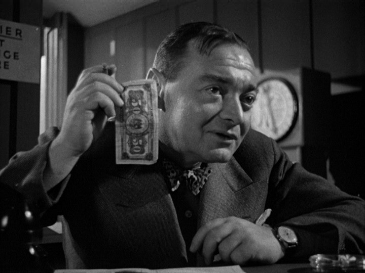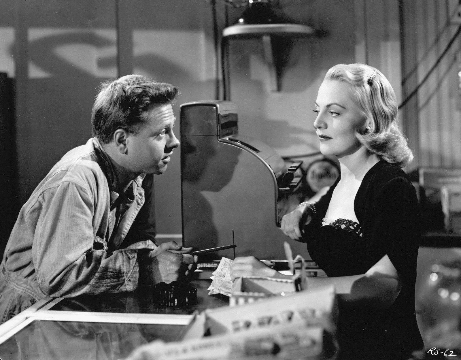 Auto mechanic ‘Dan Brady’ (Rooney, 28) scores a date with blond-bomber cashier ‘Vera Novak’ (her name out to flash a warning?), but while hot to trot he’s also out of cash. He lifts a twenty from his job’s cash register. Trying to cover the petty theft he ends up in an increasing cycle of ever-larger schemes, including scams linked to Vera’s former boss (and flame), penny-arcade scuzz ‘Nick Dramoshag (again with the watch-your-wallet moniker), played to the seedy, switchblade-flicking hilt by Lorre. Meanwhile, Vera turns out to be harder than a lug wrench and designed to twist.