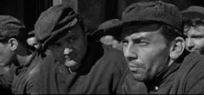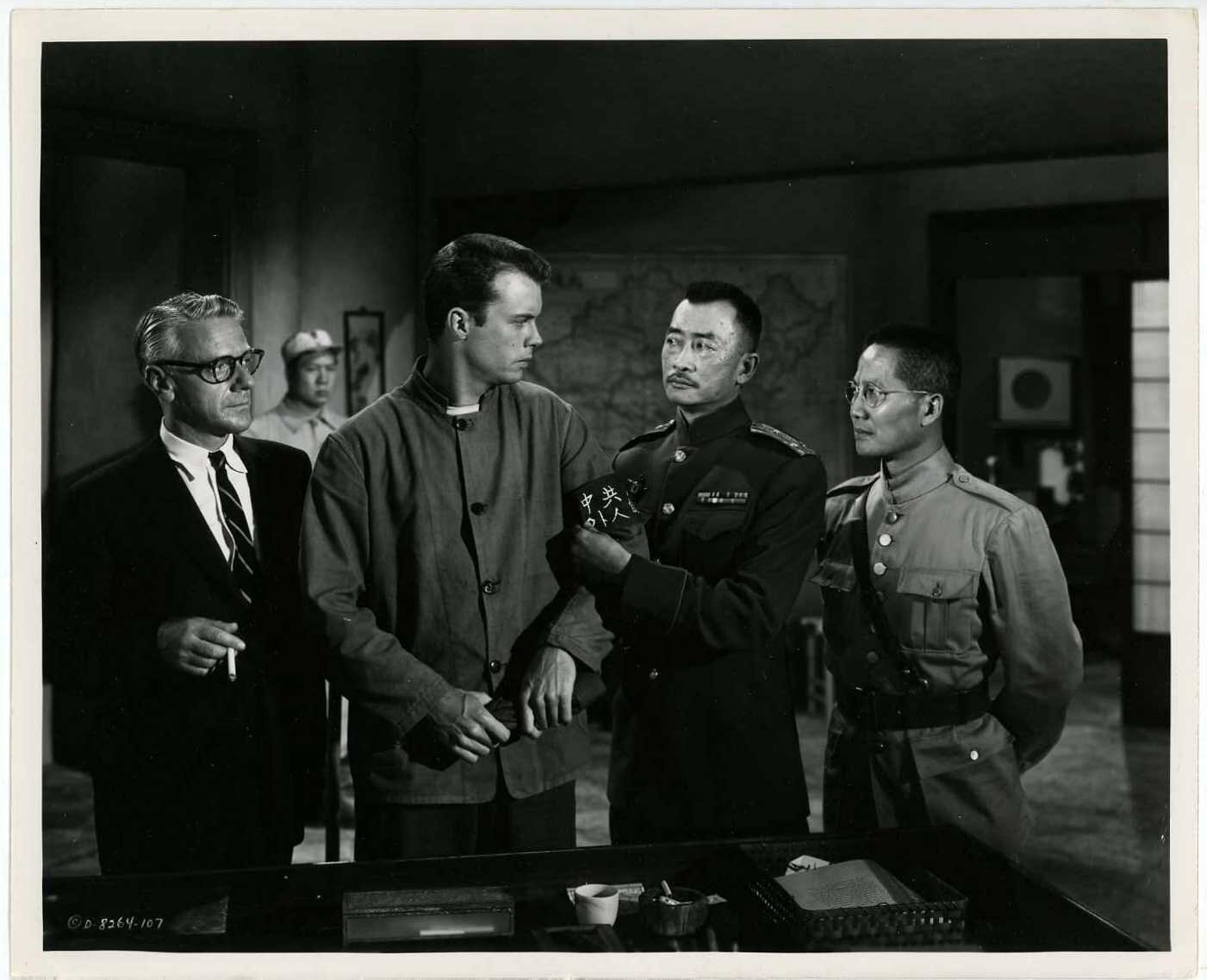 American prisoners at a camp in North Korea (or China, it isn’t made clear) have barely adequate food, shelter or any sort of medical care and are subjected to “re-education” harangues by their captors. Only ‘Sgt. Rand’ (Robert Keith) has it better, since he’s co-operating with the Communists, deemed a “Progressive” by the captors, who include a British ‘Comrade Clayton’ (Miles Malleson), a brainwashing expert from Moscow, there with his alluring Russian ballerina (what else?) wife (Dianne Foster), who Rand becomes involved with. New arrival ‘Cpl. Brady’ (Brian Keith) wonders what Rand’s real deal is, while ‘Father Francis Dolan’ (E.G. Marshall) tries to be helpful. But who’s really up to what?