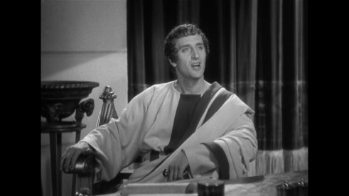Not-bad dialogue contends with mostly stagy acting, especially in the supporting roles. Tall and burly Foster, 34, does well enough by the action-prone protagonist: he was in seven films that year, including The Informer and Annie Oakley. The thespic honors belong to Basil Rathbone as a remorseful Pontius Pilate. Also in seven productions that year, Basil was breaking big, adding style and panache to a quartet of classics in David Copperfield, A Tale Of Two Cities, Captain Blood and Anna Karenina. **