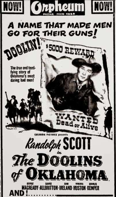 THE DOOLINS OF OKLAHOMA are led by Randolph Scott in this pretty good 1949 western, with Randy as the outlaw who formed a new gang after the Dalton Brothers went out in a blaze of gunfire. The okay script from Kenneth Gamet (Flying Tigers, Wake Of The Red Witch) basically takes up where 1940’s When The Daltons Rode left off, though in the earlier hoedown Scott played a fictional character. Here, directed by the action-adept Gordon Douglas, he’s the real-life Bill Doolin, leader of what became “The Wild Bunch” (not the Peckinpah quartet), which eventually included Butch Cassidy. Cassidy is absent here, but a few of the gang names are thrown around for flavor to salt the mostly wishful screenplay.