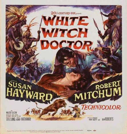 WHITE WITCH DOCTOR conjured up 96 minutes of hokum in 1953, putting Robert Mitchum and Susan Hayward into safari togs for an adventure set in the Belgian Congo of 1907. Though critics were unmoved (how many facial muscles does smirking require?), audiences made it #31 in a year bulging with matinee escapism. The pulpy plotline has animal trapper Mitchum taking nurse Hayward to a remote Congolese village. There she will work healing juju on the natives, if local wildlife and irate tribesmen don’t separate her pluck and altruism into edible portions. Walter Slezak plays Mitchum’s business partner, who has motives more monetary than medicinal. While the stars manage to keep straight faces (Hayward mercifully a tad less histrionic than usual), easily the best feature is Bernard Herrmann’s soundtrack, launching things with excitement: he crafted two more excellent adventure scores that year, for King Of The Khyber Rifles and Beneath the 12-Mile Reef.