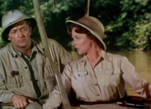 Roy Ward Baker was on to direct, but he contracted a debilitating fever when shooting 2nd-unit footage in the pestilential recesses of the Congo, so Henry Hathaway was then assigned the safe stateside shooting at the Fox studio ranch in Calabasas, California, and on sound stages back in L.A. The obviously phony sets clash with the authentic footage, further sending up the enterprise as a goof. Things get furiously furry with a full-on sample of silliness in an early scene when Mitchum has to face down a dude in a gorilla suit, played by legendary “get-the-ape-guy” Charles Gemora.