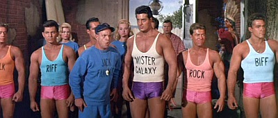 Lead hulk among the oiled-up brigade is ‘Flex Martian’, played by Rock Stevens, who’d revert to his real name Peter Lupus for 7 seasons of Mission: Impossible. His followers are ‘Biff’,’Rock’,’Tug’,’Riff’,’Hulk’,’Sulk’ and ‘Clod’. Plus there’s Morey Amsterdam–but why? Eight songs are mouthed by various cast members including one from 13-year-old Stevie Wonder (billed as Little Stevie Wonder). “Running Wild”, done by Avalon, is not bad, the rest are.