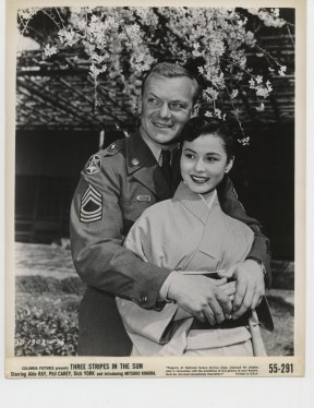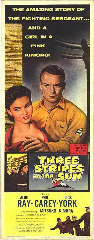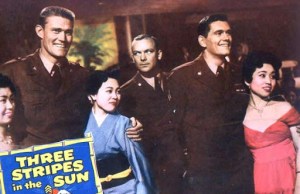 THREE STRIPES IN THE SUN, a thoughtful, fact-based 1955 drama written & directed by Richard Murphy, was inspired by a New Yorker article titled “The Gentle Wolfhound”, telling the story of an American soldier who overcame his wartime anti-Japanese feelings during the postwar occupation of the country. The title conjoins the rank stripes of his uniform with Japan’s symbolic “rising sun”. *