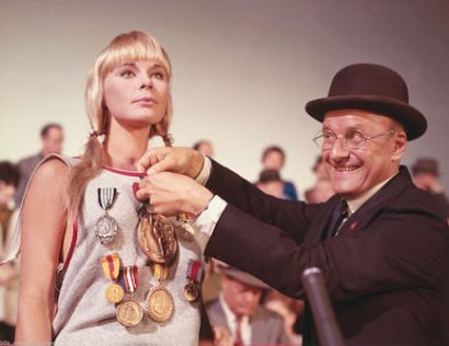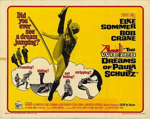 THE WICKED DREAMS OF PAULA SCHULTZ crept into theaters on Jan.3, 1968, the first release of the year. In terms of content, handling and reception it didn’t bode well for what lay ahead: throughout the year the comedies that followed were, with few exceptions, a resoundingly lame lot. In this instance, someone had a good idea—headline the beautiful and charming Elke Sommer, mostly minus clothes—and two bad ones—making gags out of escaping East Germany, and casting the oil slick Bob Crane as her leading man, with three of his confederates from TVs Hogan’s Heroes as blundering foils. Not a glimmering entry on the long resume of director George Marshall. *
