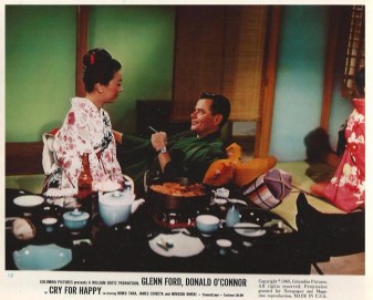 CRY FOR HAPPY, a 1961 comedy, mixes service farce (the US Navy, again) with culture clash humor, and is part of what amounted to a geisha subgenre that ran from roughly ’56 to ’62—The Teahouse Of The August Moon, Sayonara, The Barbarian And The Geisha, The Geisha Boy, My Geisha. Directed by George Marshall, the screenplay by Irving Brecher (Meet Me In St.Louis, The Life Of Riley, Bye Bye Birdie) was off a bittersweet, risqué novel written a few years earlier by George Campbell, an ex-Navy officer who presumably knew the territory.