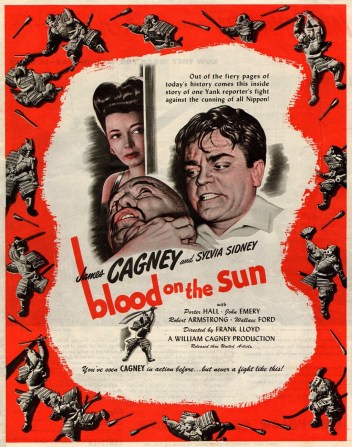 BLOOD ON THE SUN has an American newspaperman scooping the scheme behind Japan’s militant nationalism as it took shape during the decade before World War Two, when conquest-bent factions were banzai-bent on steering the country to Imperial glory. Directed by Frank Lloyd, written by Lester Cole, it lets us know “Forgive your enemies. But first, get even.” *
