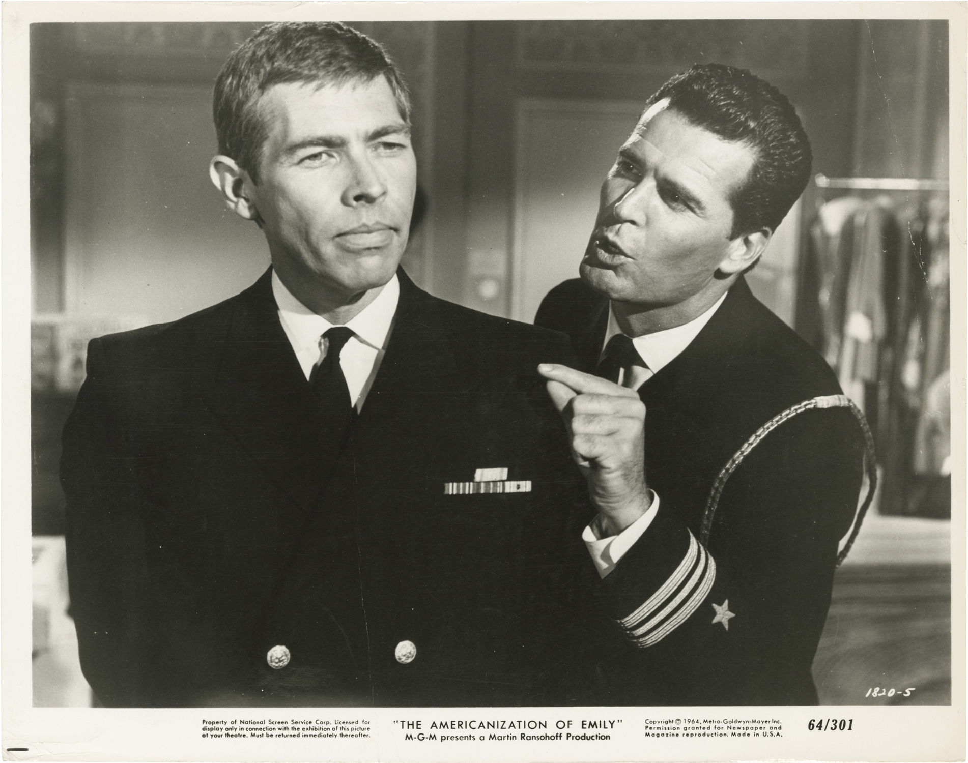 THE AMERICANIZATION OF EMILY was James Garner’s favorite among the movies he made in his five-decade career, and the character he played was likewise his top pick. He’d just done four successful comedies in a row as well as the classic The Great Escape. Like that rousing actioner and 36 Hours, a sober drama that followed this one, it’s set in WW2, but couldn’t be more different in tone and intention. Normally, the Defense Department and one or more of the services would lend support to a military-themed picture. But producer Martin Ransohoff found they wouldn’t touch this acid attack on “glory”, especially not when they were gearing up for an epic-sized, unheroic folly over in Vietnam. *