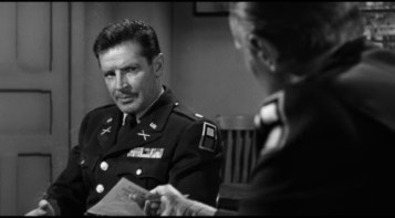 After a dramatic start in a frigid North Korean P.O.W. camp, the consequence stakes are raised back in the States as the frustrated but conscientious and determined Edwards pries out the truth, through assorted intimate confrontations with Cargill, his distraught wife (June Lockhart), glib witness ‘Lt. Miller’ (Rip Torn, 25, his first credited role), and fuming ‘Lt. General Connors’ (ever-dependable Carl Benton Reid).