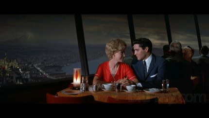 Aside from ogling O’Brien and Craig, enduring the tot, and wondering how many pints of Brylcreem were lacquered into Elvis’s hair, the movie is a sweet nostalgic experience for those who recall the wonderful World’s Fair and its exhibits. The views of the site and bygone Seattle (they made sure to get sunny days) make putting up with the dopey plot and limpid songs worthwhile. Get chuckles from the Space Needle sequence and how it ‘revolves’.