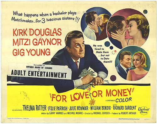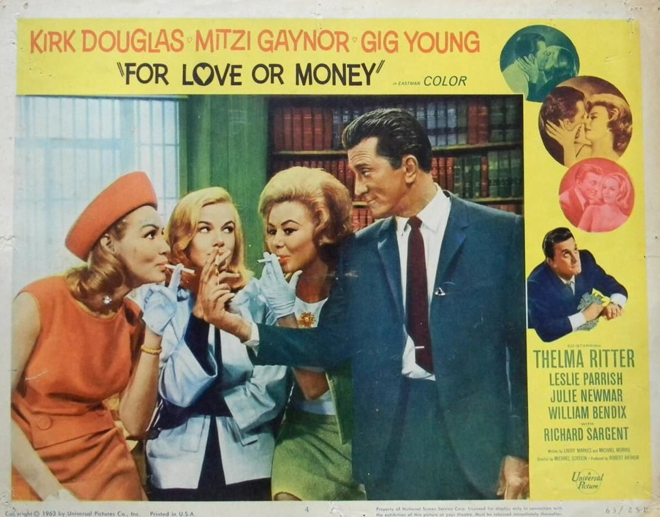FOR LOVE OR MONEY would be the question behind why this movie was made, with the answer obvious in short order: L-for-loot. Another 60’s comedy (1963 in this case) struggling to be “with it”, the script by Larry Markes and Michael Morris begging for grins and delivering grimaces. Directed by Michael Gordon, who a few years earlier helped make Pillow Talk sparkle for Doris Day and Rock Hudson. But along with a limp script, this wet biscuit he has miscast and mismatched leads in Kirk Douglas and Mitzi Gaynor. Instead of a Rock & Doris Play Set, there’s no chemistry fizz with Kirk & Mitzi. Some co-stars provide what little fun there is. *