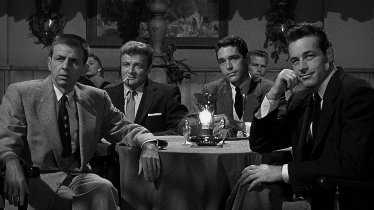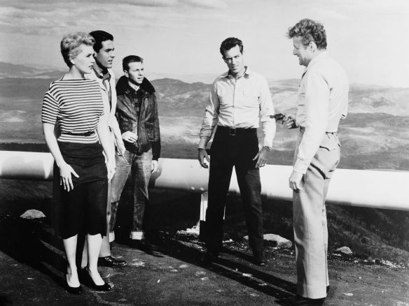 Buffered by on-location filming in Reno and near Lake Tahoe, and marked at one point by an insanely dangerous stunt (running across railroad tracks, about one foot in front of a moving train!), it’s a jackpot of lame writing and unformed performances. The smug banter is embarrassing comic-book stuff, the dramatic elements hole-peppered cardboard pulp. The 5 are Guy Madison, Brian Keith, Kim Novak, Alvy Moore and Kerwin Matthews. For a start, fight to dismiss that the guys are pretty unlikely college students (ages ranging 28 to 33); Kim, plausible, but her off-campus chick isn’t a student but a lounge singer.