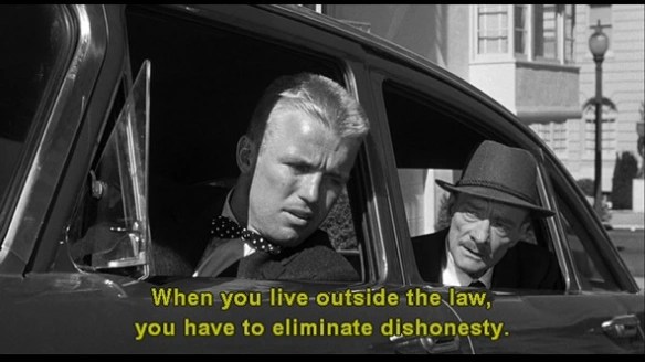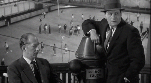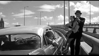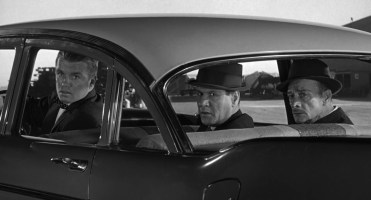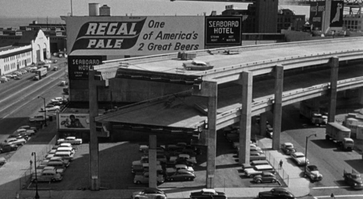 This was only 42-year-old stage actor Wallach’s second film (after Baby Doll), while Keith, 59 (father of Brian Keith) had delivered strong work throughout the decade, and Jaeckel, 31, had been a dependable presence since 1943’s Guadalcanal Diary. Their sparring interplay—and the teasing dynamic between Dancer and Julian—is fun-creepy, and when the action comes, director Siegel stages it memorably. That includes an insanely-timed stunt drive, stopping a speeding 1957 Plymouth Belvedere perilously near the edge/plunge of the unfinished Embarcadero Freeway. Further great use is made of the city’s locations—broad daylight noir—by cameraman Hal Mohr. *