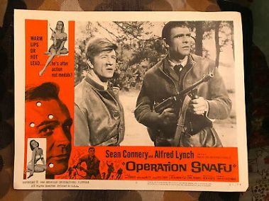 ON THE FIDDLE, a weak WW2 comedy from England in 1961, was re-released in America in 1965 as Operation Snafu, and when it lived down to that title, was rechristened as the totally misleading Operation Warhead. The long-delayed, fiddled-with US release came about because by then co-star Sean Connery had turned superstar as James Bond. Sean plays ‘second fiddle’ to Alfred Lynch, who was getting stage notice as one of the “kitchen sink” lads of the day. Lynch, 29, sort of a cross of Albert Finney by way of Michael Caine, but lacking the former’s force and the latter’s charm, didn’t catch on as a film lead, but he did nail a neat role a few years later, supporting Connery, on The Hill. *