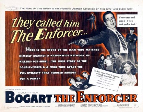 THE ENFORCER, the last of Humphrey Bogart’s 57 pictures for Warner Brothers, this 1951 farewell offered, fittingly, another crime flick. Since he’d been a star for a decade, this time he wasn’t a criminal, but a district attorney. A tough one, though, who gets to throw a few punches and make eventual use of a handy .38 when the time comes. Bogey’s good, although he didn’t care for the property, which he felt was retrograde, and there were personnel issues early in the shoot, with director Bretaigne Windust getting some pitch-in assistance from Raoul Walsh. Martin Rackin wrote the screenplay. *