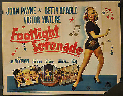 FOOTLIGHT SERENADE, a Betty Grable musical lark from 1942, flanked by attention from hunks John Payne and Victor Mature, with Jane Wyman (as ‘Flo La Verne’) on caustic galfriend duty, and Phil Silvers for patter. Innocuous amusement, directed by Gregory Ratoff. *