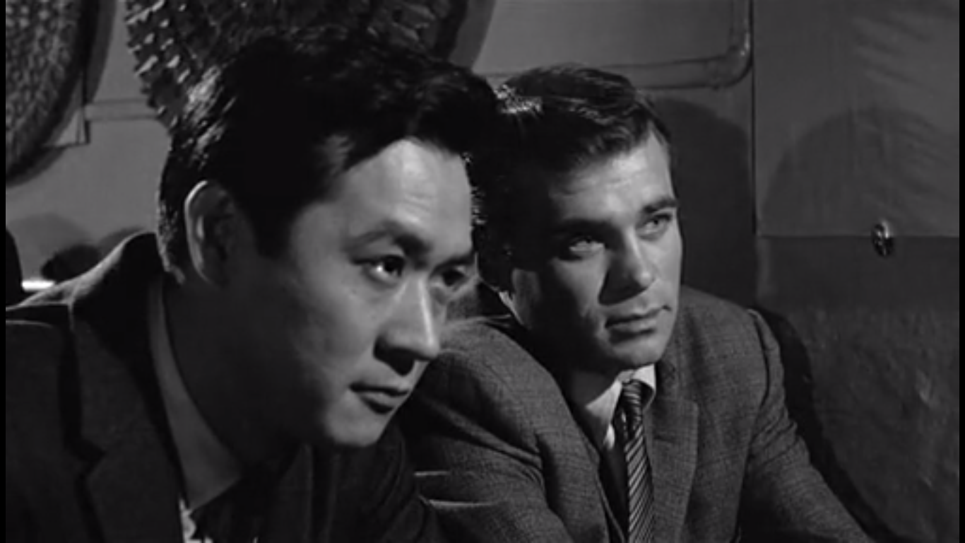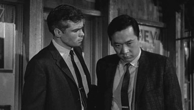 Los Angeles. When stripper ‘Sugar Torch’ is gunned down on a busy street in “Little Tokyo”, detectives ‘Joe Kojako’ (James Shigeta) and ‘Charlie Bancroft’ (Glenn Corbett), Korean war buddies and room-mates, get the case. After art student ‘Christine Downes’ (Victoria Shaw) does a sketch of a likely suspect, both cops fall for her in turn. The easygoing Joe reveals his interest after the more insistent Charlie has commenced courting, and Christine readily reciprocates. These are all sped-up situations. Joe’s worried that Charlie will take it badly (they’re friends and all); his other concern is over the racial aspect (Joe being Japanese-American, Christine a Caucasian). His own reverse prejudices flame up. Meanwhile, there’s a killer to track.