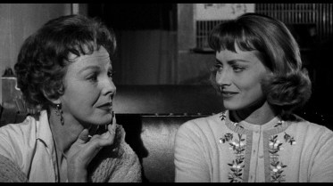 Over on the Dish vs. Dame front, Shaw, a former model from Australia, is attractive but placid here (much better in the earlier Edge To Eternity, her career was brief), while veteran Anna Lee gets more scenery to chew, playing a cynical, hard-drinking, cigar-toking avant-garde artist who goes by ‘Mac’. Quaffing bourbon, Mac makes with morsels like “You’ll find my murals in Skid Row’s finest bars and brothels” and “Smoking a cigarette is like drinking beer out of a thimble. A man is only a man, my dear, but a good cigar is a smoke.”