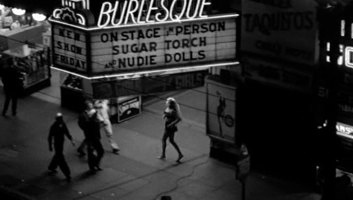 * Fuller, on the murder scene opener: “I had the cameras hidden so I could get the real reaction of people seeing an almost naked girl running down Sixth and Main Street. And most of the people she passed didn’t even turn around. I wanted her to fall…right in the middle of all the traffic passing. This was real traffic, except that I had father and daughter stunt drivers who would know this naked girl would run in front and be shot. It’s real traffic, but it’s timed, they’re in the lead. So we did it, hidden cameras, and I shot my gun into the sky and she falls. And as soon as we got it we bundled her into the car and took off. And then the shit hit the fan. A lot of people heard the shot, saw the girl fall, and they called the cops. And the cops came and they’re looking for the body of this big stripper. I still had to get a close shot and we couldn’t go back there for hours, until the cops cleared off. ”