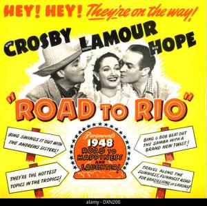 ROAD TO RIO, the 5th ‘Road’ picture with Bob Hope, Bing Crosby and Dorothy Lamour, was a major audience grabber from 1947; often called one of the best of the seven in the series. The title tells you where they’re headed, although the cast and crew never got closer to Brazil than the back lot at Paramount. Gags (topical, self-kidding and slapstick), songs (unmemorable), footwork (amusing), guest acts, and hypnosis for a plot gimmick.