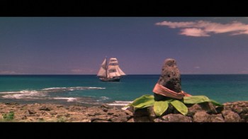 An ironic commentary on how the 50th state had changed since the time-setting of the story comes through a sampling of ‘authentic’ props rounded up for the production. Pili leaves no longer exist in Hawaii, so thatch came from Japan. The Philippines gave up rooster feathers for costuming, royal cloaks were provided from Hong Kong. Ireland yielded woven tapa cloth, Mexico straw mats, adorning bracelets and necklaces arrived from India, silk via Taiwan. Statues of Tiki gods, drums and weapons were crafted in California. Two dozen outrigger canoes were restored, as well as a pair of Danish-built sailing ships, the 1936 brigantine ‘Grethe’ (later known as ‘Romance’) and the 1921 barque/whaler ‘Wandia’, rebuilt from the hull up as the ‘Carthaginian’.