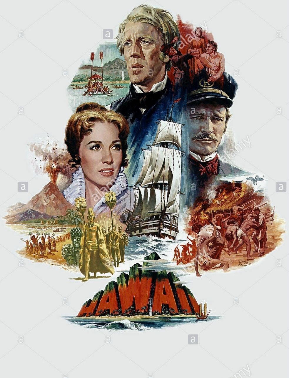 Woefully unprepared except for their ardent faith, Christian missionaries come to “pagan” Hawaii in the 1820s, hell-bent to win the “heathen” over to Jesus. The most pious thumper is ‘Abner Hale’ (Max Von Sydow), who’s sincere but severe, an Old Testament God-fearer—and fear dispenser—whereas his newly-wed wife ‘Jerusha’ (Julie Andrews) wins converts through her gentleness and tact. Over the years, the Hale’s earn the trust of ‘Malama Kanakoa’ (Jocelyn LeGarde) the sacred and beloved matriarch ‘Aliʻi Nui’, a fictionalized embodiment of Queen Ka’ahumanu (1772-1832). They and their hosts endure plague, gales, riots and childbirth (Andrews excruciating delivery scene makes the other troubles look trifling). Further complications come from Jerusha’s former suitor, rowdy whaling captain ‘Rafer Hoxworth’ (Richard Harris), a lusty rascal at odds with the inflexible Abner on every level.