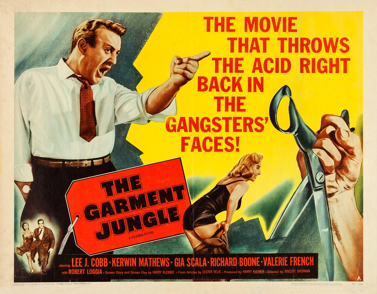 THE GARMENT JUNGLE, an okay crime-in-clothing programmer from 1957, has sweat shop owner Lee J. Cobb so determined to keep his workers from unionizing that he allows hood Richard Boone (as ‘Artie Ravidge’) to use murderous thugs to intimidate employees and organizers. This includes sending one unlucky complainer on a one-way elevator ride, brakeless. Cobb’s son Kerwin Matthews sides with the union.