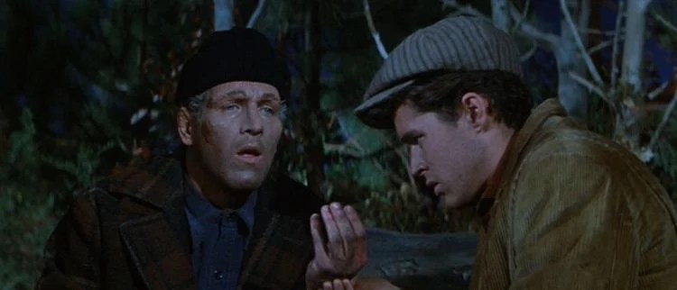 Though Nick/Beymer carry the film, they’re backed by more vivid characters and stronger actors. Some have only one or two scenes: Dan Dailey as an alcoholic publicist, Fred Clark as a burlesque producer, James Dunn a telegrapher, Diane Baker the girl left behind, Corinne Calvet as a recruiter for the ambulance corps. Larger roles are well done by Arthur Kennedy, as Nick’s browbeaten father (emulating Hemingway’s), and Jessica Tandy, as the severe, bible-thumping mother (the bane of the author’s life). Susan Strasberg is the main romantic interest, but she and Beymer don’t really connect. Her segment as a nurse in the Italy-WW1 stuff reprising “Farewell” is the longest, greatly helped by engaging turns from Eli Wallach and Ricardo Montalban as Italian soldiers who befriend the adventure-seeking American. The most telling passage comes early in the journey when Nick encounters hobo pals ‘The Battler’, a brain-addled ex-boxer, and his minder ‘Bugs’, played by Paul Newman and Juano Hernandez. Aided by a face-mashing makeup job and a one-punch-too-many vocal interpretation, Newman gets the showiest role in the story, and Hernandez offers a quietly sturdy counterweight.