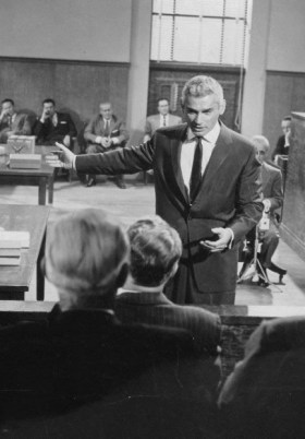 Hot-shot New York criminal defense attorney ‘James Gordon Blane’ (Chandler) queries blithely bold trophy wife ‘Charleen Reston’ (Elaine Stewart): “Mrs. Reston, are you a faithful wife?” Her smirking “In my fashion…” lets us know Blane’s client, her husband, had reason to be jealous. Still, plugging her lover several times makes guilt a certainty. But Blane’s skillful defense gets him off, and that’s too much for seemingly amiable local sheriff ‘Nick Hoak’ (Jack Carson) who soon has Blane in boiling water for purportedly bribing a witness. The slick big city lawyer may have met his match in the bluff small town lawman.