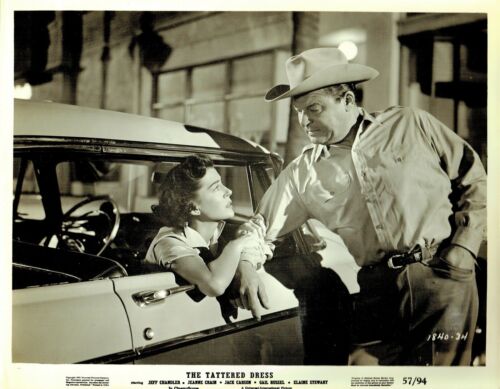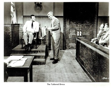 THE TATTERED DRESS was ripped by lust that provoked a murder in this 1957 legal jeopardy drama. The year saw justice served or denied in the better, more honored Witness For The Prosecution, 12 Angry Men and Paths of Glory. Yet this sexed-up, reasonably brisk entry, forgotten today, did more box office business than the latter two, testimony to how popular Jeff Chandler was at the time. Though it veers into greater histrionic intensity than needed in the last act, for the most part it’s a pretty good stacked-deck outing, directed by Jack Arnold off a screenplay from George Zuckerman (Written On The Wind). Grosses tagged $4,100,000, placing 58th for ’57. *