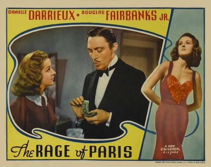 THE RAGE OF PARIS is a neat discovery, an overlooked comedy from 1938 that served to introduce Danielle Darrieux, a 21-year-old French gamine making her Hollywood debut, sparring with Douglas Fairbanks, Jr. Lots of fun, written by Bruce Manning and Felix Jackson, directed by Henry Koster, it placed a respectable 49th that year, grossing $3,600,000. *