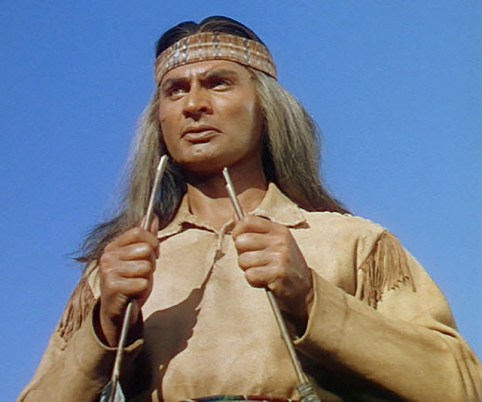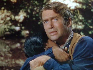Directed by Delmer Daves, who was particularly adept at handling action with pictorial style, the screenplay by Albert Maltz was riffed off the 558 pages of Elliott Arnold’s novel “Blood Brother”, putting fictional elements (like the interracial romance) into the factual outline. Stewart’s fine, adding this to his better, tougher western that year, Winchester ’73 (he also scored two comedies, Harvey and The Jackpot). Of course, following movie tradition—and unspoken racial taboos underlining them—the doe-eyed beauty has to perish, ironically softballing the script’s otherwise commendable acceptance of Native Americans. Some may find it a tad unsettling that the gorgeous Debra Paget was only 15 and Jimmy was 41. Imposing in stature and voice, Jeff Chandler makes a vivid impression as Cochise, quietly conveying power, intelligence and authority. We’ll leave the p.c. casting critics to their ceaseless sputtering. While Jeff & Debra more than make up for their makeup by their sincere acting, Daves and producer Julius Blaustein did employ 240 Apaches from the Fort Apache Indian Reservation. *