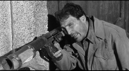 The action scenes are straightforward and pitiless, memorably grueling at a key point, but in the main it’s the intense interplay between the characters that grips you, vitally etched by actors clearly relishing the chance to let loose and walk right up to the fine line between cold reality and hot melodrama. Palance’s customary brio is taken down a notch to simmering sensitivity, his distinctive visage adding a haunting eloquence to Costa’s outrage. Rising light Marvin gets to go big and dangerous as the manipulative Colonel, a political opportunist who sees a gain in every loss. Palance’s squad is a choice team that includes Buddy Ebsen, Robert Strauss and Richard Jaeckel. Stage actor William Smithers does well in his feature debut. Best of all is Albert, tearing into the cowardly, eventually deliriously unhinged Cooney, a stunning change of pace from his general nice-guy persona (Aldrich would later give him two more capital-B bastard roles in The Longest Yard and Hustle); he’s terrific. Joseph Biroc’s camerawork is top notch. **