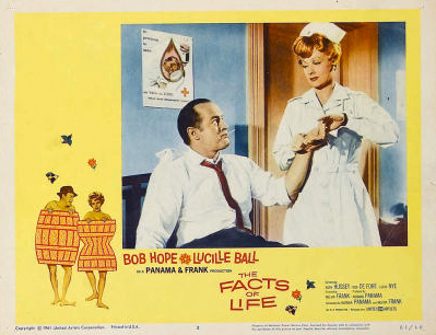 THE FACTS OF LIFE reteamed Bob Hope and Lucille Ball in 1960 and gave Hope, 57, his biggest earner since The Seven Little Foys five years back. It was a return to features for Ball, 48, who’d been occupied with her TV empire. Dated, of course, but still funny thanks to the star’s commitment to the material, the rom-com was written, directed & produced by Melvin Frank & Norman Panama. Fans saw that it placed 27th for the year, grossing $9,100,000. Then it scooped an Oscar for Edith Head’s costume design and pulled nominations for the script, the art direction, cinematography (neat work from Charles Lang), and the title song written by Johnny Mercer, brightly sung by Steve Lawrence & Eydie Gorme. *