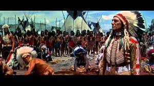 * “The treaty pen does not fit our hand as well as the arrow.” That sinking feeling: the opening admonition recalls Broken Arrow because co-writer Delmer Daves wrote & directed that 1950 success, which also showcased lovely Paget as a desire-stirring maiden. How much of this script was concocted by co-scenarist Leo Townsend we can’t say, but note he was the fella who later gave forth tribal essays Beach Blanket Bingo and How To Stuff A Wild Bikini. Though the Wyoming-lensed scenes used Fort Laramie, there’s a possibility the studio also employed some sets built five years earlier for another Fox epic, the ignored, much better Two Flags West. Diligent digging yields only the suspicion.