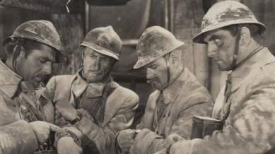 Impressed by the 1932 French film Les Croix de Bois (Wooden Crosses), Fox producer Darryl F. Zanuck bought the rights, and Hawks used some footage from the earlier film (the French answer to All Quiet On The Western Front) to augment his battle scenes filmed in California. Writing the script, William Faulkner and Joel Sayre (with input from Nunnally Johnson) also reworked elements from Hawks’ 1930 The Dawn Patrol and his 1933 Today We Live, so the material wasn’t exactly fresh, but the actors are so good they provide cover for the familiarity. As the nurse who comes between March and Baxter, 19 year-old June Lang isn’t so much a “find” as just ‘found’: she’s not convincing. Neither is old pro Lionel Barrymore, in hamming mode as the glory-stuck papa of burned-out Baxter. Baxter and March, however, are excellent, and the teeth-jarring sound effects alone will have you rethink enlisting for someone else’s idea of freedom.
