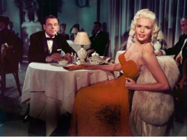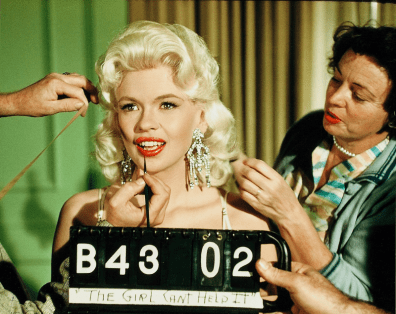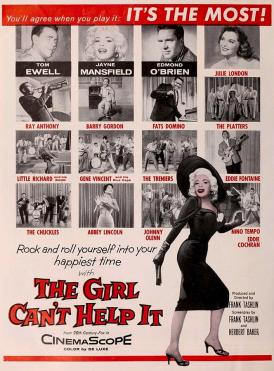 THE GIRL CAN’T HELP IT was a big hit comedy in 1956. While one portion of the gleefully gaudy satire wears itself out, others remain time-capsule fun. There are a good deal of ha-ha one-liners, including some that honk the double entendre button like atomic annihilation was nigh. For fanciers of early rock & roll, it’s a seminal exercise, with a slew of numbers belted by class-acts of the day. For those intrigued by the sociological aspects of a culture’s fascination with basics, the Hollywood or & bust broadside of Jayne Mansfield’s 40-18½-36 figure will raise either temperatures, guffaws or battle flags, depending on whether or not you’re secure enough to take a gag that makes fun while having it: Jayne could. From It’s A Mad, Mad, Mad, Mad World we quote Terry-Thomas: “…and this positively infantile preoccupation with bosoms! *