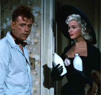 Directed, produced & co-written by Frank Tashlin, the film revels in sight gags that do everything to play up Mansfield’s cartoonish sexpot image; thankfully she’s good-spirited enough to play along, and is more likable here than in other attempts to suggest that her outsized bod and outlandish publicity antics could somehow counter, let alone replace the genuine talent of Marilyn Monroe. Ewell had just knocked one out of the park with MM in The Seven Year Itch, though he takes a decided backseat to the overall production design here.