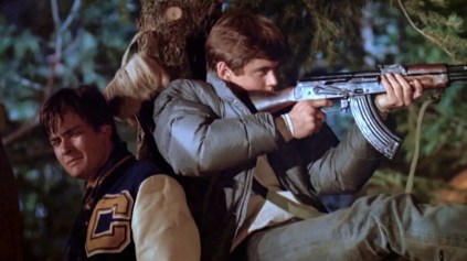 RED DAWN over Colorado, as the Commies come to Calumet, the all-American hamlet in this infamous fantasygasm from The Year of Our Ronald 1984. Infiltration, nukes and elite paratroops pave the way for Soviet hordes descending through Alaska while on the southern border, Mexico down for the count, “the whole Cuban and Nicaraguan army came walkin’ right through”. World War 3 is on with a surprise invasion of the heartland, but it didn’t dawn on the Reds that they’d come face-to-barrel with ferocious “Wolverines!” Thank the Lord for well-armed teenagers.