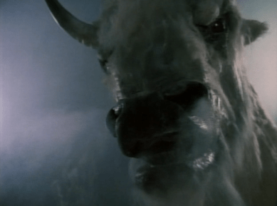 The main complaint lodged against this wild & wooly rumble (Moby Dick with hoofs) is that the creature created isn’t convincing and suspense is spoiled since the belligerent bison’s let out of the bag too soon—at the very start—and also that the episodic plot feels pasted together. True, the animatronic animal designed by Carlo Rambaldi—who’d done the mock (and mocked) ape for executive producer Dino De Laurentiis’ King Kong—doesn’t look at all real, and the pastiche of face-offs and fights that lead up to the Big Finish have more pizzazz than the payoff; the quick 97-minute running time possibly denuded of helpful backstory.