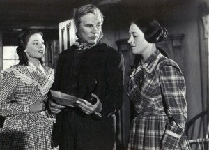 With the backdrop of the ‘Anti-Rent War’ that rocked New York from 1839 to 1845, the Gothic-flavored family drama unfolds with excellent characterizations from the stars (the offbeat Price getting his first full-fledged lead) and supporting players. Offering solace or sabotage are Glenn Langan (sympathetic ‘Dr. Jeff Turner’, taken with Miranda), Vivienne Osborne (Nicholas’ sickly wife ‘Johanna’), Spring Byington (against type as silkily malign housekeeper ‘Magda’) and Jessica Tandy (partially lame maid ‘Peg O’Malley’, taunted by Nicholas for her physical imperfection).