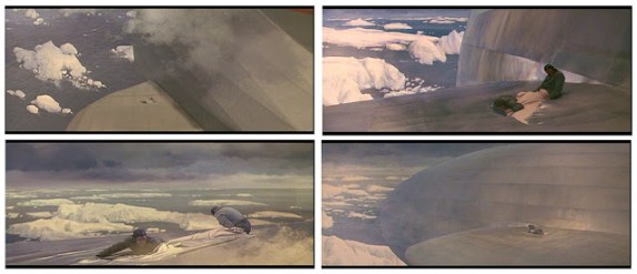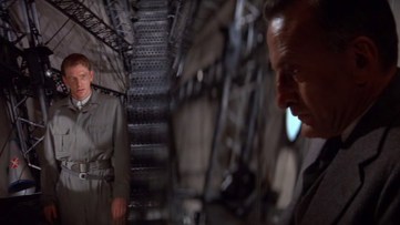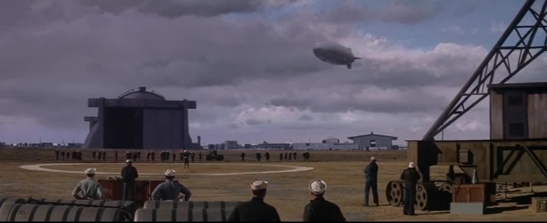 A not bad sequence with death-defying crewmen repairing a tear in the fabric works well, and the sound crew does good work with all the engine noises. Advances in special effects in the more than five decades since this came out have reduced their “cool” quotient here considerably: on the small screen (sorry, a big TV still ain’t a theater experience) they too often look their age. Then, after all the buildup, Wise and associates made the choice to switch from color to black & white and blend the familiar (to us doddering ancients, anyway) real footage of the explosion and crash with mocked-up material, and doing “dramatic” freeze-framing to further add to the artificiality. Ever hear an audience of 1,000 people do a collective “Oh, c’mon” ?