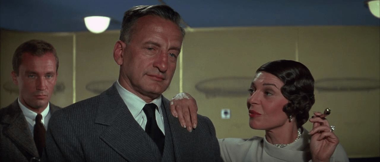 Pretty shots of the doomed dirigible (models and matte work) cruising over twinkling cities and North Atlantic icebergs alternate with bland chatter aboard, the actors gamely trying to make it interesting enough to generate the tension required to make the ultimate blazing payoff worth the prattle. George C. Scott had stayed afloat through five flops in a row, so even if this script stank and critics carped, the box office success was welcome: he plays the Luftwaffe officer tasked with security. Anne Bancroft sleepwalks through her jaded countess/vamp role, wondering why she signed on for such a cliche-hobbled part. William Atherton and Roy Thinnes, respectively a suspect crewman and Gestapo mole, do decent yeoman work. Whose idea was it put the ‘irrepressible’ (code for ‘excruciating’) Robert Clary in the mix? Weren’t there any mimes available?