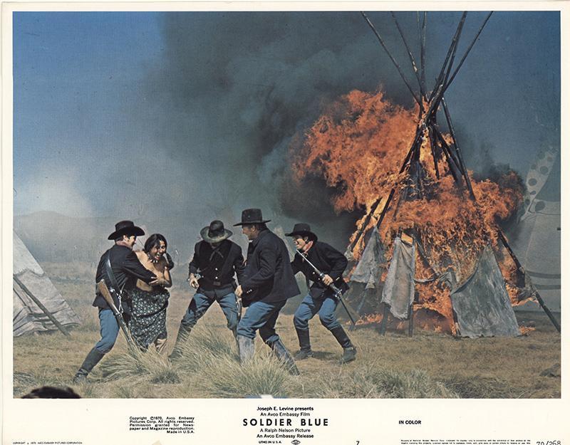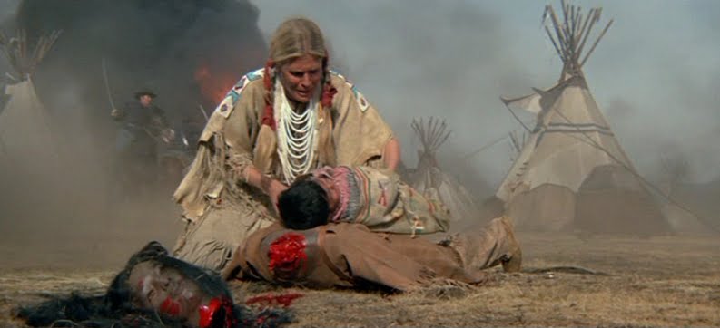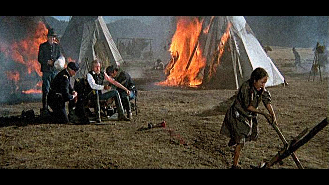 Colorado: the two survivors of a cavalry patrol wiped out by Cheyennes make their way on foot to safety at the nearest fort. By the time they make it back, a messianic Colonel intends to use his force to wreak vengeance on the tribe—men, women and children. The finale massacre is based on the brutal 1864 attack on peaceful Cheyenne’s by a Col. John Chivington (in the movie veteran John Anderson plays ‘Col. Iverson’) at Sand Creek, which saw at least 130-250 Indians murdered, with accompanying atrocities. Not content with the real figure, screenwriter John Gay and director Ralph Nelson up the total to 500, and the obvious moviegoers takeaway from their graphic depiction is that it was underscoring the recently revealed Mỹ Lai slaughter in Vietnam.