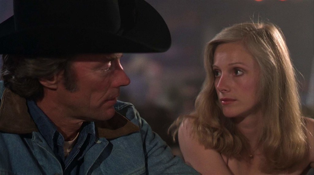 ‘Philo Beddoe’ (Eastwood) is a laid back fella, except when he’s pummeling the crap out of chumps in boxing bouts around the blue-collar West. Doofy brother ‘Orville’ (Geoffrey Lewis) tags along, while bad-tempered ‘Ma’ (Ruth Gordon) minds the porch back in “the Valley” (San Fernando, duh) and cusses like a longshoreman (Gordon isn’t cute: she’s unbearable). The guys are accompanied by their pet simian Clyde, who easily gives the best performance. Clint’s squeeze Sondra Locke plays another nasty “user”, this time a budding country singer (cue several songs by her and guest artists) who Philo falls for: he’s kind of a dope. Meanwhile, an inept biker gang prowls around what was called a script, scrawled by Jeremy Joe Kronsberg, directed by James Fargo, who’d done Eastwood’s The Enforcer.