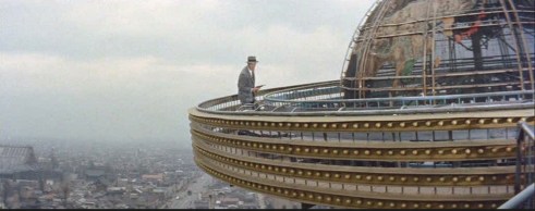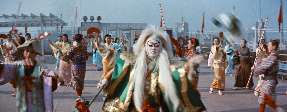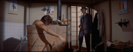 Memorable set-pieces: the opening train robbery framed against wintry Mt. Fuji; a stunning rooftop tracking shot following extravagantly costumed kabuki dancers through their routine; Ryan’s bathtub dispatch of his ‘friend’, complete with kinky post-riddling caress; the sensational gunfight finale atop a daringly-situated tilted carousel 20 stories high. Stack recalled the unease he and Ryan felt during the last, as the gizmo was rusty and was further unbalanced by the weight of the huge CinemaScope camera.