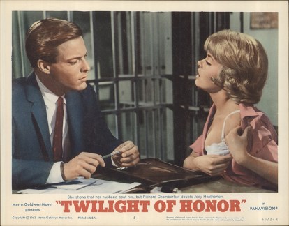 TWILIGHT OF HONOR, an ‘adult’ courtroom drama from 1963, wrested 85th on that year’s money-making list, the $2,200,000 gross probably covering what it cost to make. The case presented did manage to grasp a pair of nominations from the Academy Awards, one for Art Direction (easily taken by America America), the other, more sensationally, for Nick Adams as Supporting Actor. His twitchy patsy (the story’s defendant) lost to another life & family-casualty character, played to perfection by Melvyn Douglas in Hud. The desperate gambit Adams made in self-advertising for an Oscar was more of a raw display than the one he offered in the movie. Nick’s failed ballyhoo did succeed in hogging credit from star Richard Chamberlain, trying out big screen leading man shoes while enjoying a cascade of fan mail from his hit TV show Dr. Kildare (1961-66). For those who have eyes it’s hard to care about either male lightweight when Joey Heatherton is torching scenery as the plot’s bad girl, the 19-year old hip-thrusting singer/dancer/vixen unleashing a brand of blatant sex tease in her feature debut. *