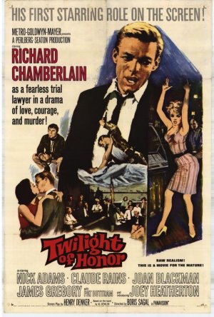 TWILIGHT OF HONOR, an ‘adult’ courtroom drama from 1963, wrested 85th on that year’s money-making list, the $2,200,000 gross probably covering what it cost to make. The case presented did manage to grasp a pair of nominations from the Academy Awards, one for Art Direction (easily taken by America America), the other, more sensationally, for Nick Adams as Supporting Actor. His twitchy patsy (the story’s defendant) lost to another life & family-casualty character, played to perfection by Melvyn Douglas in Hud. The desperate gambit Adams made in self-advertising for an Oscar was more of a raw display than the one he offered in the movie. Nick’s failed ballyhoo did succeed in hogging credit from star Richard Chamberlain, trying out big screen leading man shoes while enjoying a cascade of fan mail from his hit TV show Dr. Kildare (1961-66). For those who have eyes it’s hard to care about either male lightweight when Joey Heatherton is torching scenery as the plot’s bad girl, the 19-year old hip-thrusting singer/dancer/vixen unleashing a brand of blatant sex tease in her feature debut. *
