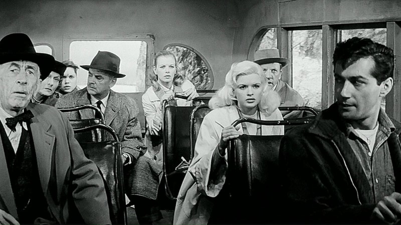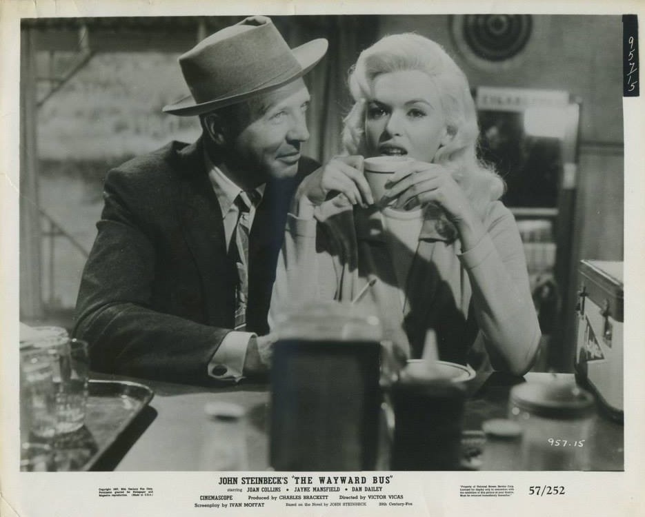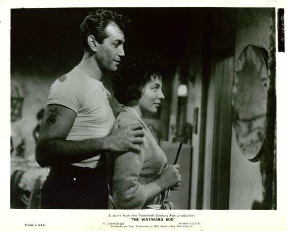 John Steinbeck’s 1947 novel had been purchased, planned, cast and scuttled for years. First George Stevens was to direct, then Henry Hathaway. William Saroyan wrote the first script. Over the decade-long germination, the stars courted or signed up, then opted out included Marlon Brando, Jennifer Jones, Robert Mitchum, Susan Hayward, Shelley Winters, Richard Widmark, Gene Tierney and Joanne Woodward. For some reason Fox honchos assigned direction of this steam-driven slice of Steinbeckian Americana to Victor Vicas, a Russian-born writer-director who’d worked in Germany and France. Ivan Moffett took over screenplay duty. Moffett had handled high-profile novel adaptations for Giant and Bhowani Junction and would later do so for They Came to Cordura and Tender Is The Night. Vicas explained the tack taken: “We’ve had to make a few changes. We’ve reduced the sex angle so it’s acceptable to the film medium, lowered the overall ages of the passengers and thrown in a few of the modern conveniences such as a helicopter rescue service. In addition, we’ve supplied a bit more suspense to the bus ride. A landslide which just misses the bus for example, and a bridge going out under the weight of the vehicle. And instead of the bus getting mired in the mud, we have it caught with one wheel over the edge of a cliff on a washed out road.”
